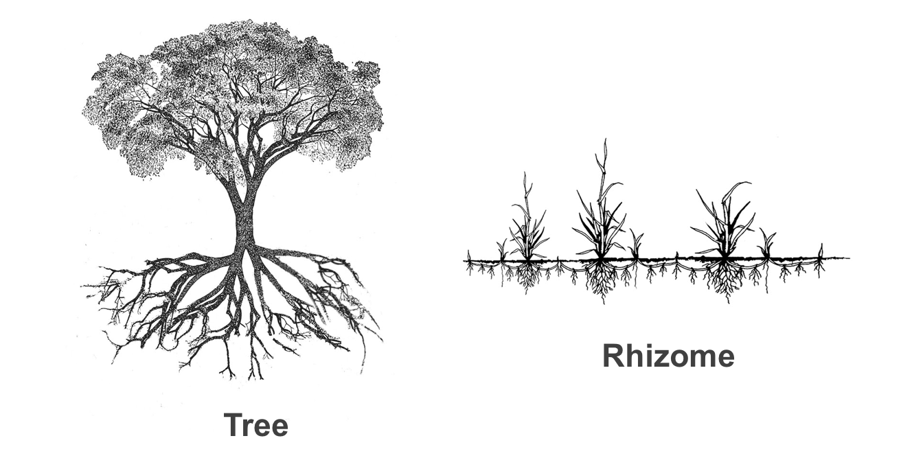 (Pegando esse conceito emprestado de Deleuze E Guatarri) o rizoma é como a grama ou certas ervas daninhas que você conhece: ele não tem um centro único. Ele se espalha horizontalmente, conectando pontos que parecem não ter relação entre si. Se você corta um pedaço de um rizoma em um canto, ele ressurge no outro, ainda mais forte.